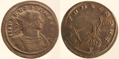 Obverse-IMP AVRELIANVS AVG Bust type A, F, G Reverse-FORTVNA REDVX Fortuna seated left by wheel, holding rudder and cornucopiae.