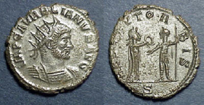 Obverse-IMP AVRELIANVS AVG Bust type F. Reverse-RESTITVT ORBIS Woman standing right, presenting wreath to emperor, who stands left.