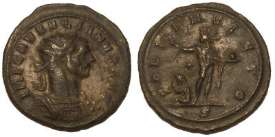 Obverse-IMP C AVRELIANVS AVG Bust type F Reverse-SOLI INVICTO Sol standing left, right hand raised, left hand holding globe, at foot a captive.