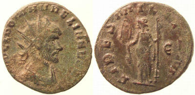 Obverse-IMP C L DOM AVRELIANVS AVG Bust type A, F Reverse-FIDES MILITVM Fides standing left, holding spear and standard.