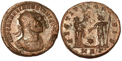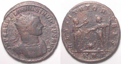 Obverse-IMP C AVRELIANVS INVICTVS AVG Bust type F. Reverse-RESTITVT ORBIS Woman standing right, presenting wreath to emperor standing left, holding scepter.