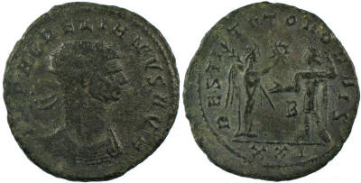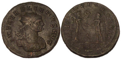 Obverse-IMP AVRELIANVS AVG Bust types A, F. Reverse-RESTITVTOR ORBIS Victory standing right, holding palm, presenting wreath to Emperor standing left, holding spear, sometimes at foot a suppliant figure.