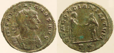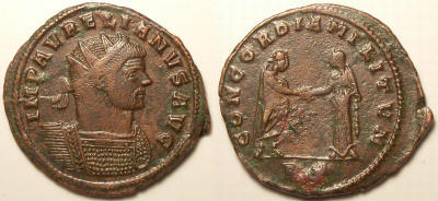 Obverse-IMP AVRELIANVS AVG Bust type F Reverse-CONCORDIA MILITVM Emperor standing right, clasping hand of Concordia standing left.