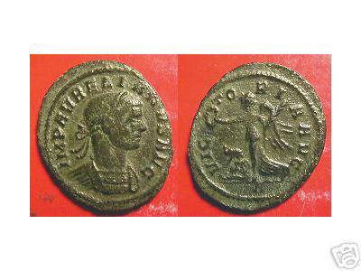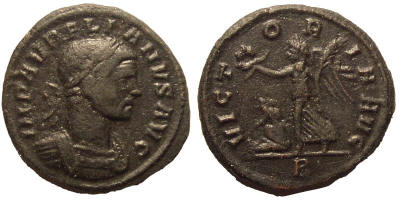 Obverse-IMP AVRELIANVS AVG Bust type B, D, E. Reverse-VICTORIA AVG Victory walking left, holding wreath and palm, at foot a captive.